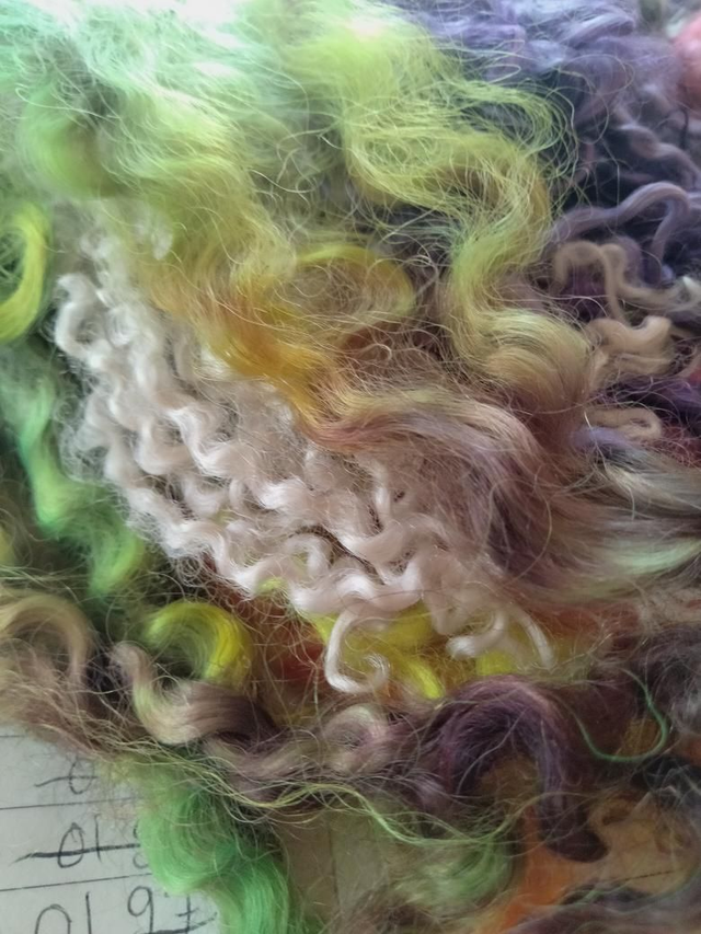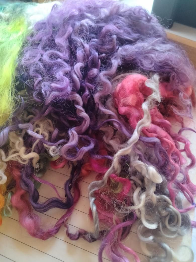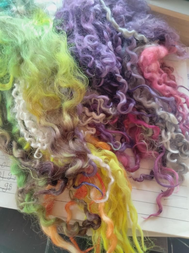 Melange de boucles teintées main de races differentes dont le Wensleydale, Lincoln Longwool, Teeswater....