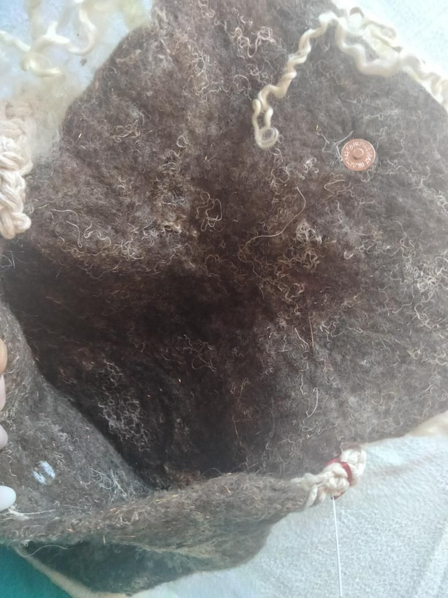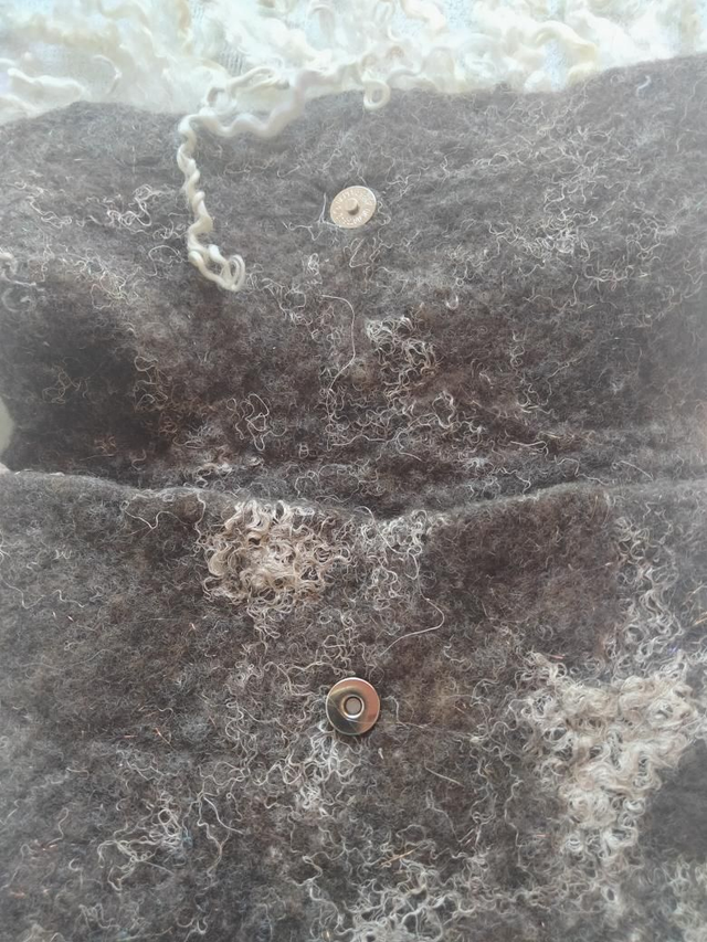 Melange de laine, soie et Angelina que j'ai cardé main, puis feutré pour faire ce joli sac.